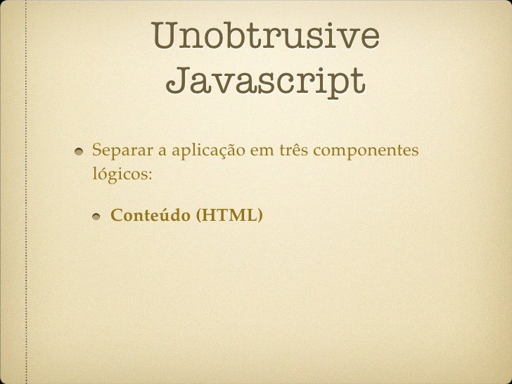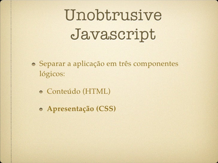 4. 4. Unobtrusive Javascript Separar a aplicação em três componentes lógicos: Conteúdo (HTML)