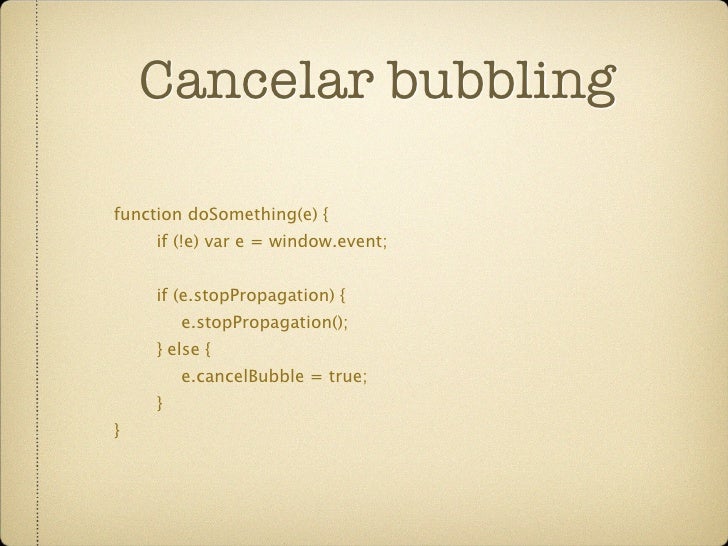 42. 42. Cancelar bubbling function doSomething(e) { if (!e) var e = window.event; if (e.stopPropagation) { e.stopPropagation(); } else { e.cancelBubble = true; } }