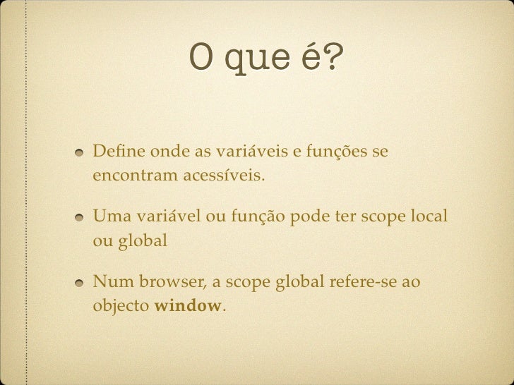 44. 44. O que é? Define onde as variáveis e funções se encontram acessíveis. Uma variável ou função pode ter scope local ou global Num browser, a scope global refere-se ao objecto window.