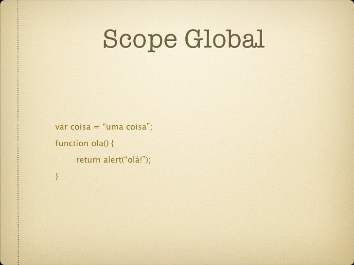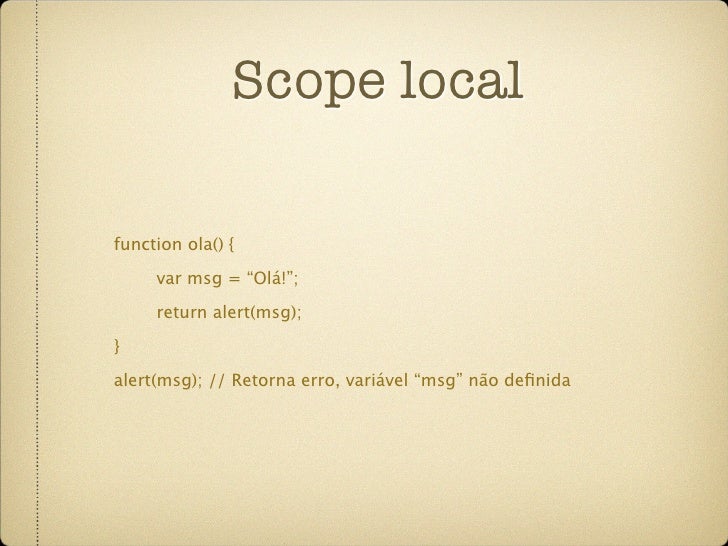 46. 46. Scope local function ola() { var msg = “Olá!”; return alert(msg); } alert(msg); // Retorna erro, variável “msg” não definida