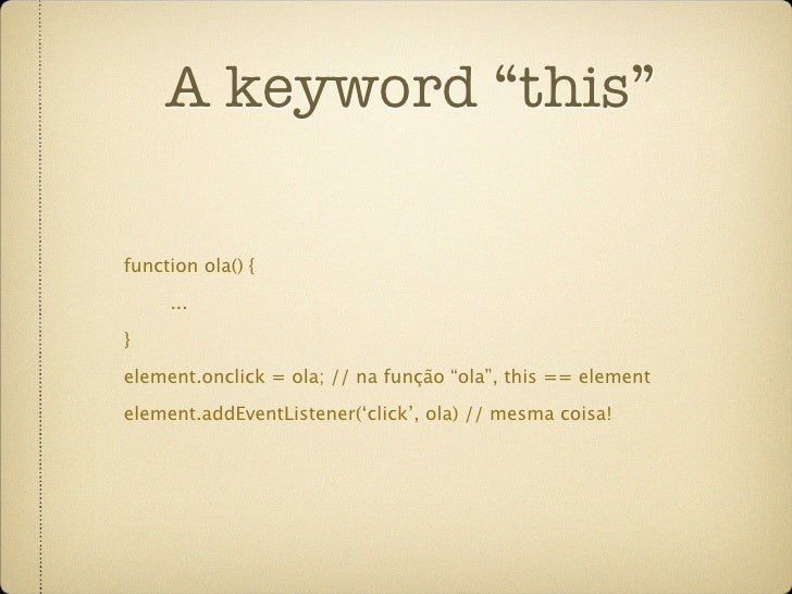 50. 50. A keyword “this” function ola() { ... } <element onclick=”ola();” /> // Função é apenas uma referência, // this == window (!)