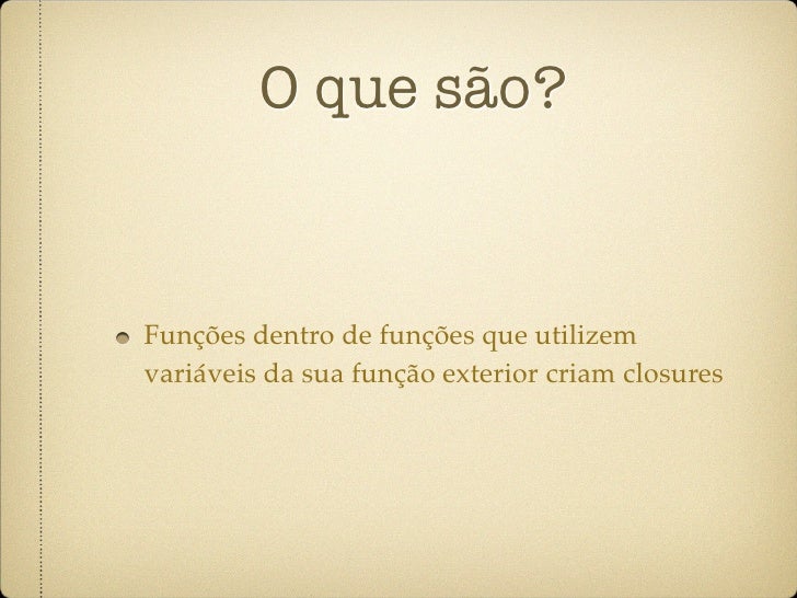 52. 52. O que são? Funções dentro de funções que utilizem variáveis da sua função exterior criam closures