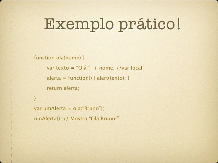 54. 54. Exemplo prático! function ola(nome) { var texto = “Olá ” + nome, //var local alerta = function() { alert(texto); } return alerta; } var umAlerta = ola(“Bruno”); umAlerta(); // Mostra “Olá Bruno!”