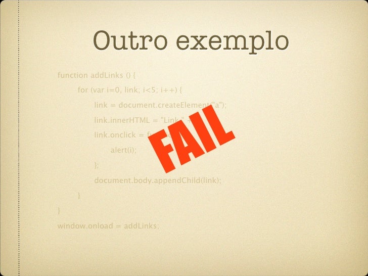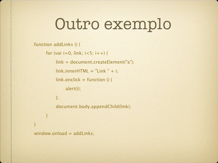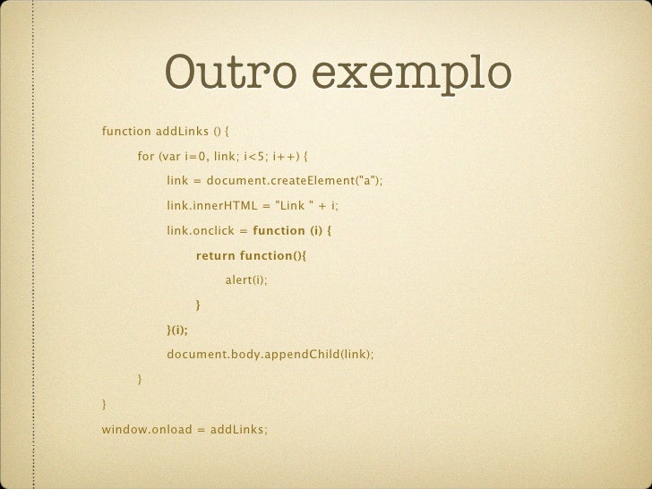 57. 57. Outro exemplo function addLinks () { for (var i=0, link; i<5; i++) { link = document.createElement("a"); link.innerHTML = "Link " + i; link.onclick = function (i) { return function(){ alert(i); } }(i); document.body.appendChild(link); } } window.onload = addLinks;