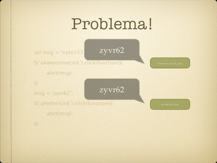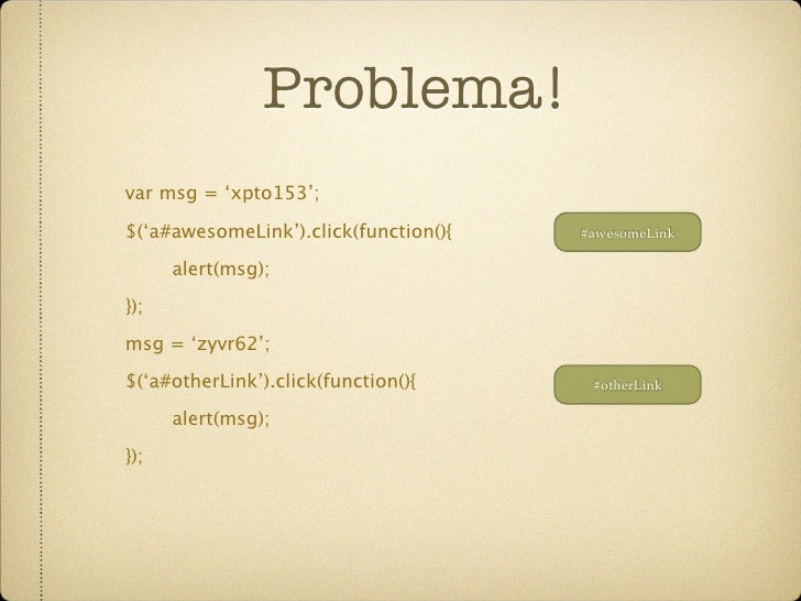 58. 58. Problema! var msg = ‘xpto153’; $(‘a#awesomeLink’).click(function(){ #awesomeLink alert(msg); }); msg = ‘zyvr62’; $(‘a#otherLink’).click(function(){ #otherLink alert(msg); });