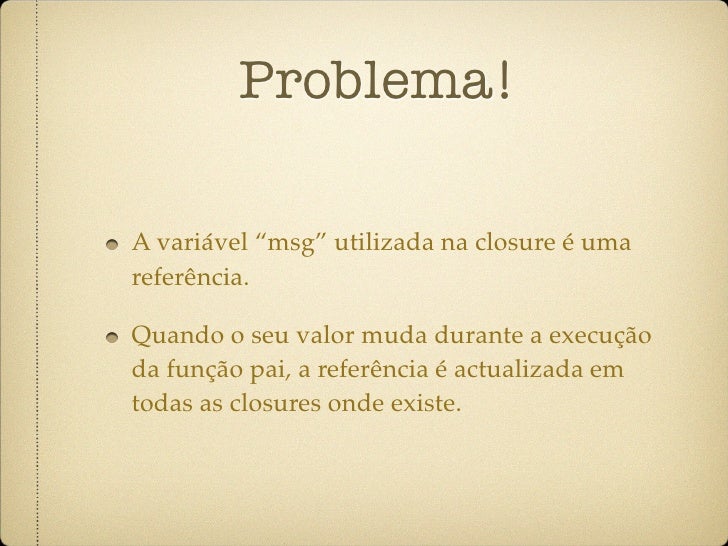 61. 61. Problema! A variável “msg” utilizada na closure é uma referência. Quando o seu valor muda durante a execução da função pai, a referência é actualizada em todas as closures onde existe.
