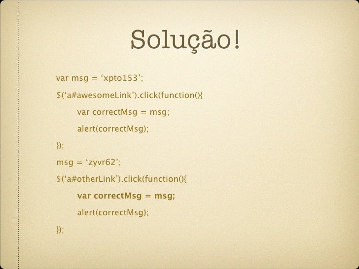 62. 62. Solução! var msg = ‘xpto153’; $(‘a#awesomeLink’).click(function(){ var correctMsg = msg; alert(correctMsg); }); msg = ‘zyvr62’; $(‘a#otherLink’).click(function(){ var correctMsg = msg; alert(correctMsg); });