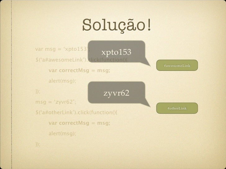 63. 63. Solução! var msg = ‘xpto153’; xpto153 $(‘a#awesomeLink’).click(function(){ #awesomeLink var correctMsg = msg; alert(msg); }); zyvr62 msg = ‘zyvr62’; #otherLink $(‘a#otherLink’).click(function(){ var correctMsg = msg; alert(msg); });