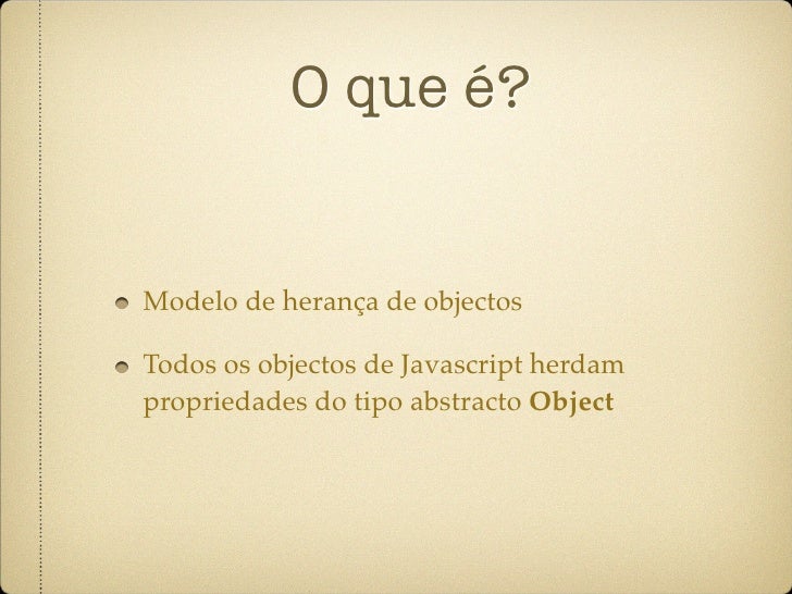 65. 65. O que é? Modelo de herança de objectos Todos os objectos de Javascript herdam propriedades do tipo abstracto Object