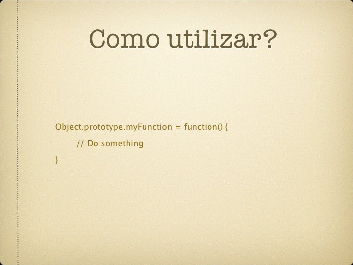 66. 66. Como utilizar? Object.prototype.myFunction = function() { // Do something }