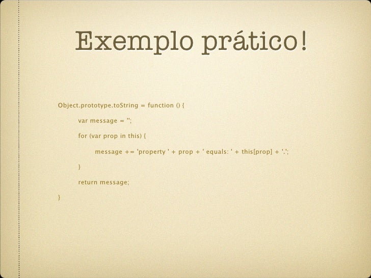 67. 67. Exemplo prático! Object.prototype.toString = function () { var message = ''; for (var prop in this) { message += 'property ' + prop + ' equals: ' + this[prop] + '.'; } return message; }