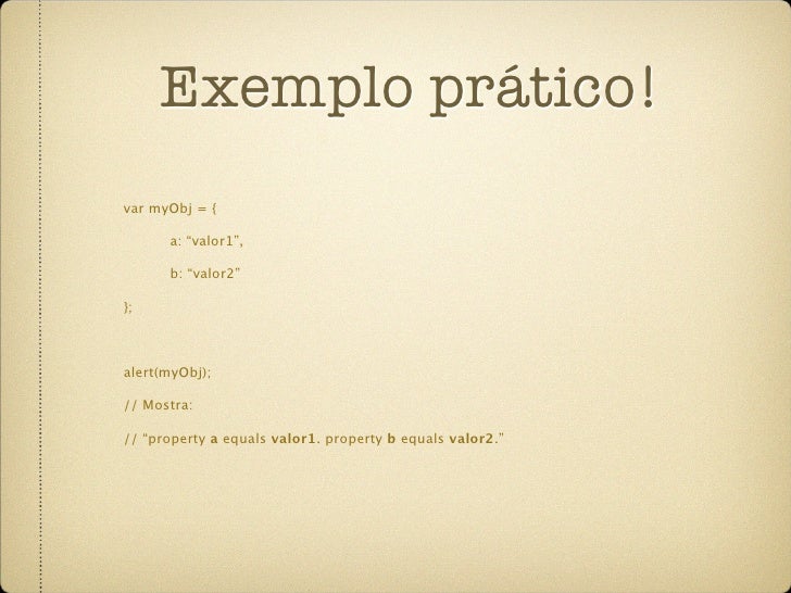 68. 68. Exemplo prático! var myObj = { a: “valor1”, b: “valor2” }; alert(myObj); // Mostra: // “property a equals valor1. property b equals valor2.”