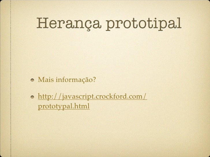 69. 69. Herança prototipal Mais informação? http://javascript.crockford.com/ prototypal.html