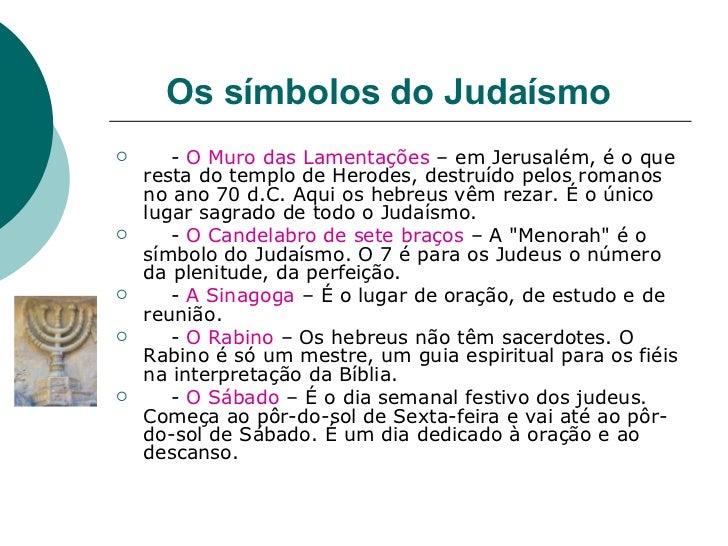 11. 11. Os símbolos do Judaísmo <ul><li>    - O Muro das Lamentações – em Jerusalém, é o que resta do templo de Herodes, destruído pelos romanos no ano 70 d.C. Aqui os hebreus vêm rezar. É o único lugar sagrado de todo o Judaísmo. </li></ul><ul><li>    - O Candelabro de sete braços – A &quot;Menorah&quot; é o símbolo do Judaísmo. O 7 é para os Judeus o número da plenitude, da perfeição. </li></ul><ul><li>    - A Sinagoga – É o lugar de oração, de estudo e de reunião. </li></ul><ul><li>    - O Rabino – Os hebreus não têm sacerdotes. O Rabino é só um mestre, um guia espiritual para os fiéis na interpretação da Bíblia. </li></ul><ul><li>    - O Sábado – É o dia semanal festivo dos judeus. Começa ao pôr-do-sol de Sexta-feira e vai até ao pôr-do-sol de Sábado. É um dia dedicado à oração e ao descanso. </li></ul>