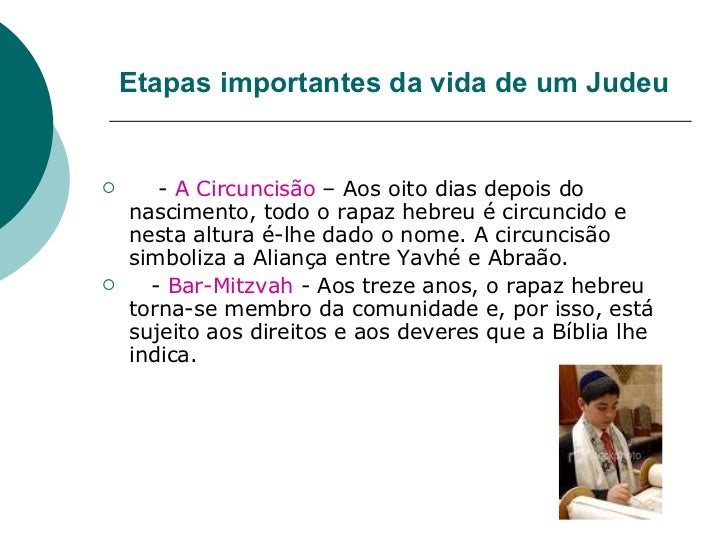 12. 12. Etapas importantes da vida de um Judeu <ul><li>    - A Circuncisão – Aos oito dias depois do nascimento, todo o rapaz hebreu é circuncido e nesta altura é-lhe dado o nome. A circuncisão simboliza a Aliança entre Yavhé e Abraão. </li></ul><ul><li>    - Bar-Mitzvah - Aos treze anos, o rapaz hebreu torna-se membro da comunidade e, por isso, está sujeito aos direitos e aos deveres que a Bíblia lhe indica. </li></ul>