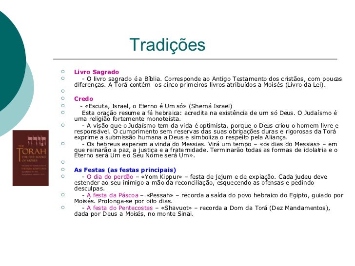 14. 14. Tradições <ul><li>Livro Sagrado </li></ul><ul><li>    - O livro sagrado é a Bíblia. Corresponde ao Antigo Testamento dos cristãos, com poucas diferenças. A Torá contém  os cinco primeiros livros atribuídos a Moisés (Livro da Lei). </li></ul><ul><li>  </li></ul><ul><li>Credo </li></ul><ul><li>   - «Escuta, Israel, o Eterno é Um só» (Shemá Israel) </li></ul><ul><li>    Esta oração resume a fé hebraica: acredita na existência de um só Deus. O Judaísmo é uma religião fortemente monoteísta. </li></ul><ul><li>    - A visão que o Judaísmo tem da vida é optimista, porque o Deus criou o homem livre e responsável. O cumprimento sem reservas das suas obrigações duras e rigorosas da Torá exprime a submissão humana a Deus e simboliza o respeito pela Aliança. </li></ul><ul><li>    - Os hebreus esperam a vinda do Messias. Virá um tempo – «os dias do Messias» – em que reinarão a paz, a justiça e a fraternidade. Terminarão todas as formas de idolatria e o Eterno será Um e o Seu Nome será Um». </li></ul><ul><li>  </li></ul><ul><li>As Festas (as festas principais) </li></ul><ul><li>    - O dia do perdão – «Yom Kippur» – festa de jejum e de expiação. Cada judeu deve estender ao seu inimigo a mão da reconciliação, esquecendo as ofensas e pedindo desculpas. </li></ul><ul><li>    - A festa da Páscoa – «Pessah» – recorda a saída do povo hebraico do Egipto, guiado por Moisés. Prolonga-se por oito dias. </li></ul><ul><li>    - A festa do Pentecostes – «Shavuot» – recorda a Dom da Torá (Dez Mandamentos), dada por Deus a Moisés, no monte Sinai. </li></ul>