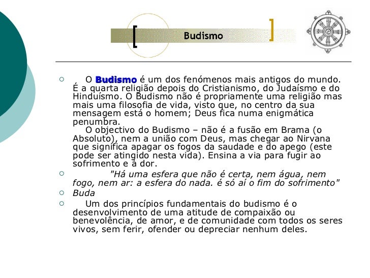 15. 15. <ul><li>    O Budismo é um dos fenómenos mais antigos do mundo. É a quarta religião depois do Cristianismo, do Judaísmo e do Hinduísmo. O Budismo não é propriamente uma religião mas mais uma filosofia de vida, visto que, no centro da sua mensagem está o homem; Deus fica numa enigmática penumbra.     O objectivo do Budismo – não é a fusão em Brama (o Absoluto), nem a união com Deus, mas chegar ao Nirvana que significa apagar os fogos da saudade e do apego (este pode ser atingido nesta vida). Ensina a via para fugir ao sofrimento e à dor.   </li></ul><ul><li>            &quot;Há uma esfera que não é certa, nem água, nem fogo, nem ar: a esfera do nada. é só aí o fim do sofrimento&quot; </li></ul><ul><li>Buda </li></ul><ul><li>    Um dos princípios fundamentais do budismo é o desenvolvimento de uma atitude de compaixão ou benevolência, de amor, e de comunidade com todos os seres vivos, sem ferir, ofender ou depreciar nenhum deles. </li></ul>