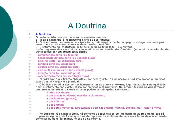 17. 17. A Doutrina <ul><li>A Doutrina </li></ul><ul><li>O credo budista consiste nas «quatro verdades santas»: 1- Toda a existência é insatisfatória e cheia de sofrimento; 2- Este sofrimento é causado pela ignorância, pelo desejo ardente ou apego – esforço constante para encontrar algo de eterno e estável num mundo transitório; 3- O sofrimento ou insatisfação pode-se superar na totalidade – é o Nirvana; 4- Consegue-se alcançar a nirvana seguindo o nobre cominho das Oito Vias: (estas oito vias não têm de ser seguidas por um ordem estabelecida) </li></ul><ul><li>- compreensão certa (ou fé pura) </li></ul><ul><li>- pensamento dirigido certo (ou vontade pura) </li></ul><ul><li>- discurso certo (ou linguagem pura) </li></ul><ul><li>- conduta certa (ou acção pura) </li></ul><ul><li>- esforço certo (ou aplicação pura) </li></ul><ul><li>- vida certa (ou meios de subsistência puros) </li></ul><ul><li>- atenção certa (ou memória pura) </li></ul><ul><li>- concentração certa (ou meditação pura) </li></ul><ul><li>    Par alcançar a purificação absoluta e, por conseguinte, a iluminação, o Budismo propõe numerosos exercícios. O «Yoga» é o principal. </li></ul><ul><li>    O budismo acredita que um ser humano antes de atingir o Nirvana, lugar de absoluta tranquilidade, onde o sofrimento não existe, passa por diversos renascimentos. No interior de roda da vida jazem as seis esferas de existência onde os seres podem ser obrigados a renascer: </li></ul><ul><li>            o reino dos deuses </li></ul><ul><li>            o dos asuras ou deuses rebeldes e ciumentos; </li></ul><ul><li>            a dos famintos (pretas); </li></ul><ul><li>            o dos infernos </li></ul><ul><li>            o dos animais </li></ul><ul><li>            o dos seres humanos, caracterizado pelo nascimento, velhice, doença, mal - estar e morte </li></ul><ul><li>  </li></ul><ul><li>    No Budismo não existe a alma. Há somente a sequência de um momento de aparecimento que dá origem ao seguinte, de forma que a morte representa simplesmente uma nova forma de aparecimento, como ser humano ou animal, no céu ou no inferno. </li></ul>