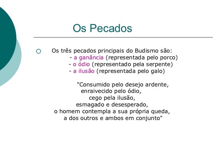 19. 19. Os Pecados <ul><li>      </li></ul>Os três pecados principais do Budismo são:             - a ganância (representada pelo porco)           - o ódio (representado pela serpente)      - a ilusão (representada pelo galo)               &quot;Consumido pelo desejo ardente, enraivecido pelo ódio, cego pela ilusão, esmagado e desesperado, o homem contempla a sua própria queda, a dos outros e ambos em conjunto&quot;