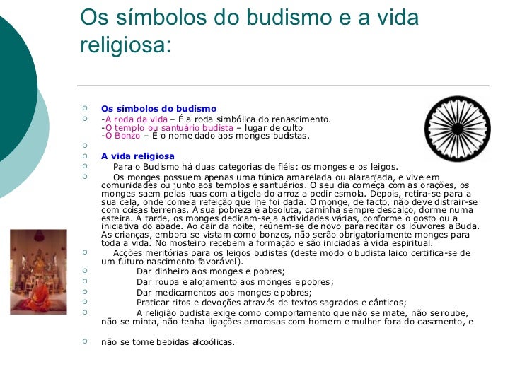 20. 20. Os símbolos do budismo e a vida religiosa: <ul><li>Os símbolos do budismo </li></ul><ul><li>- A roda da vida – É a roda simbólica do renascimento. - O templo ou santuário budista – lugar de culto - O Bonzo – É o nome dado aos monges budistas. </li></ul><ul><li>  </li></ul><ul><li>A vida religiosa </li></ul><ul><li>    Para o Budismo há duas categorias de fiéis: os monges e os leigos. </li></ul><ul><li>    Os monges possuem apenas uma túnica amarelada ou alaranjada, e vive em comunidades ou junto aos templos e santuários. O seu dia começa com as orações, os monges saem pelas ruas com a tigela do arroz a pedir esmola. Depois, retira-se para a sua cela, onde come a refeição que lhe foi dada. O monge, de facto, não deve distrair-se com coisas terrenas. A sua pobreza é absoluta, caminha sempre descalço, dorme numa esteira. À tarde, os monges dedicam-se a actividades várias, conforme o gosto ou a iniciativa do abade. Ao cair da noite, reúnem-se de novo para recitar os louvores a Buda. As crianças, embora se vistam como bonzos, não serão obrigatoriamente monges para toda a vida. No mosteiro recebem a formação e são iniciadas à vida espiritual. </li></ul><ul><li>    Acções meritórias para os leigos budistas (deste modo o budista laico certifica-se de um futuro nascimento favorável). </li></ul><ul><li>            Dar dinheiro aos monges e pobres; </li></ul><ul><li>            Dar roupa e alojamento aos monges e pobres; </li></ul><ul><li>            Dar medicamentos aos monges e pobres; </li></ul><ul><li>            Praticar ritos e devoções através de textos sagrados e cânticos; </li></ul><ul><li>            A religião budista exige como comportamento que não se mate, não se roube, não se minta, não tenha ligações amorosas com homem e mulher fora do casamento, e </li></ul><ul><li>não se tome bebidas alcoólicas. </li></ul>