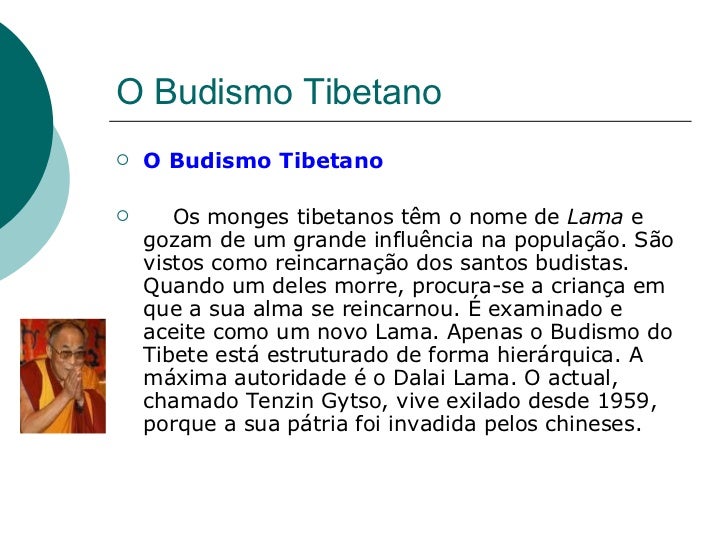 22. 22. O Budismo Tibetano <ul><li>O Budismo Tibetano </li></ul><ul><li>    Os monges tibetanos têm o nome de Lama e gozam de um grande influência na população. São vistos como reincarnação dos santos budistas. Quando um deles morre, procura-se a criança em que a sua alma se reincarnou. É examinado e aceite como um novo Lama. Apenas o Budismo do Tibete está estruturado de forma hierárquica. A máxima autoridade é o Dalai Lama. O actual, chamado Tenzin Gytso, vive exilado desde 1959, porque a sua pátria foi invadida pelos chineses. </li></ul>