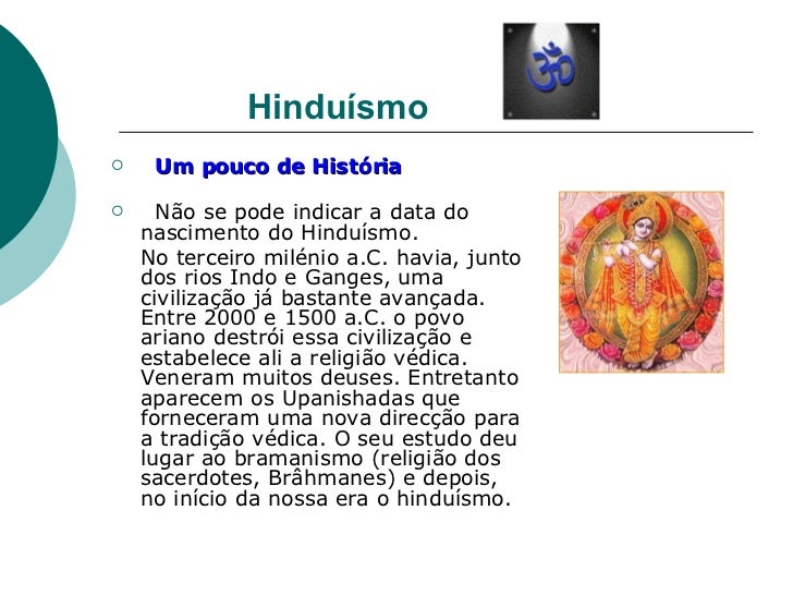 23. 23. Hinduísmo <ul><li>    Um pouco de História </li></ul><ul><li>  Não se pode indicar a data do nascimento do Hinduísmo. </li></ul><ul><li>No terceiro milénio a.C. havia, junto dos rios Indo e Ganges, uma civilização já bastante avançada. Entre 2000 e 1500 a.C. o povo ariano destrói essa civilização e estabelece ali a religião védica. Veneram muitos deuses. Entretanto aparecem os Upanishadas que forneceram uma nova direcção para a tradição védica. O seu estudo deu lugar ao bramanismo (religião dos sacerdotes, Brâhmanes) e depois, no início da nossa era o hinduísmo. </li></ul>