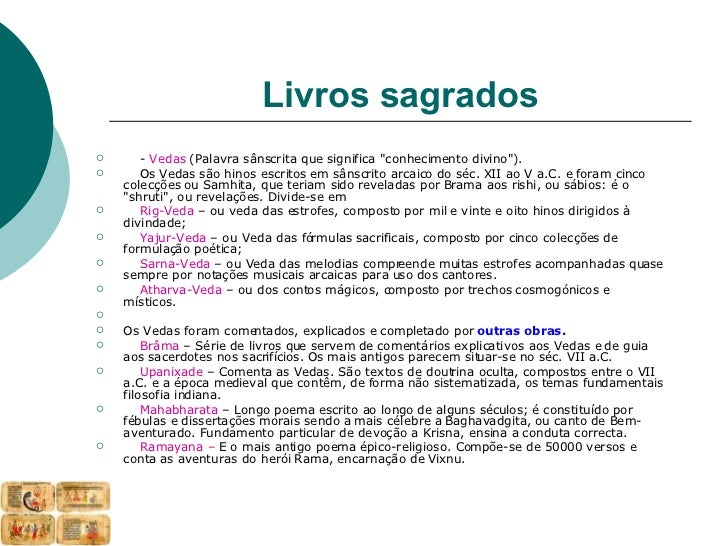 24. 24. Livros sagrados <ul><li>     - Vedas (Palavra sânscrita que significa &quot;conhecimento divino&quot;). </li></ul><ul><li>    Os Vedas são hinos escritos em sânscrito arcaico do séc. XII ao V a.C. e foram cinco colecções ou Samhita, que teriam sido reveladas por Brama aos rishi, ou sábios: é o &quot;shruti&quot;, ou revelações. Divide-se em </li></ul><ul><li>    Rig-Veda – ou veda das estrofes, composto por mil e vinte e oito hinos dirigidos à divindade; </li></ul><ul><li>    Yajur-Veda – ou Veda das fórmulas sacrificais, composto por cinco colecções de formulação poética; </li></ul><ul><li>    Sarna-Veda – ou Veda das melodias compreende muitas estrofes acompanhadas quase sempre por notações musicais arcaicas para uso dos cantores. </li></ul><ul><li>    Atharva-Veda – ou dos contos mágicos, composto por trechos cosmogónicos e místicos. </li></ul><ul><li>  </li></ul><ul><li>Os Vedas foram comentados, explicados e completado por outras obras.        </li></ul><ul><li>    Brâma – Série de livros que servem de comentários explicativos aos Vedas e de guia aos sacerdotes nos sacrifícios. Os mais antigos parecem situar-se no séc. VII a.C. </li></ul><ul><li>    Upanixade – Comenta as Vedas. São textos de doutrina oculta, compostos entre o VII a.C. e a época medieval que contêm, de forma não sistematizada, os temas fundamentais filosofia indiana. </li></ul><ul><li>    Mahabharata – Longo poema escrito ao longo de alguns séculos; é constituído por fébulas e dissertações morais sendo a mais célebre a Baghavadgita, ou canto de Bem-aventurado. Fundamento particular de devoção a Krisna, ensina a conduta correcta. </li></ul><ul><li>    Ramayana – E o mais antigo poema épico-religioso. Compõe-se de 50000 versos e conta as aventuras do herói Rama, encarnação de Vixnu. </li></ul>