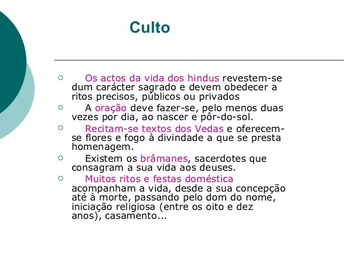 26. 26. Culto <ul><li>    Os actos da vida dos hindus revestem-se dum carácter sagrado e devem obedecer a ritos precisos, públicos ou privados </li></ul><ul><li>    A oração deve fazer-se, pelo menos duas vezes por dia, ao nascer e pôr-do-sol. </li></ul><ul><li>    Recitam-se textos dos Vedas e oferecem-se flores e fogo à divindade a que se presta homenagem. </li></ul><ul><li>    Existem os brâmanes , sacerdotes que consagram a sua vida aos deuses. </li></ul><ul><li>    Muitos ritos e festas doméstica acompanham a vida, desde a sua concepção até à morte, passando pelo dom do nome, iniciação religiosa (entre os oito e dez anos), casamento... </li></ul>