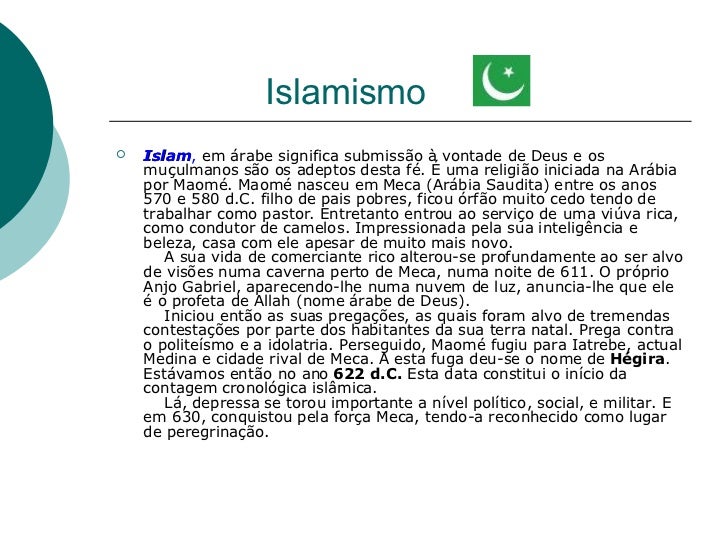 3. 3. Islamismo <ul><li>Islam , em árabe significa submissão à vontade de Deus e os muçulmanos são os adeptos desta fé. É uma religião iniciada na Arábia por Maomé. Maomé nasceu em Meca (Arábia Saudita) entre os anos 570 e 580 d.C. filho de pais pobres, ficou órfão muito cedo tendo de trabalhar como pastor. Entretanto entrou ao serviço de uma viúva rica, como condutor de camelos. Impressionada pela sua inteligência e beleza, casa com ele apesar de muito mais novo.     A sua vida de comerciante rico alterou-se profundamente ao ser alvo de visões numa caverna perto de Meca, numa noite de 611. O próprio Anjo Gabriel, aparecendo-lhe numa nuvem de luz, anuncia-lhe que ele é o profeta de Allah (nome árabe de Deus).     Iniciou então as suas pregações, as quais foram alvo de tremendas contestações por parte dos habitantes da sua terra natal. Prega contra o politeísmo e a idolatria. Perseguido, Maomé fugiu para Iatrebe, actual Medina e cidade rival de Meca. A esta fuga deu-se o nome de Hégira . Estávamos então no ano 622 d.C. Esta data constitui o início da contagem cronológica islâmica.     Lá, depressa se torou importante a nível político, social, e militar. E em 630, conquistou pela força Meca, tendo-a reconhecido como lugar de peregrinação. </li></ul>