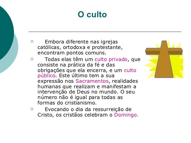 32. 32.   O culto <ul><li>    Embora diferente nas igrejas católicas, ortodoxa e protestante, encontram pontos comuns. </li></ul><ul><li>    Todas elas têm um culto privado , que consiste na prática da fé e das obrigações que ela encerra, e um culto público . Este último tem a sua expressão nos Sacramentos , realidades humanas que realizam e manifestam a intervenção de Deus no mundo. O seu número não é igual para todas as formas do cristianismo. </li></ul><ul><li>    Evocando o dia da ressurreição de Cristo, os cristãos celebram o Domingo. </li></ul>
