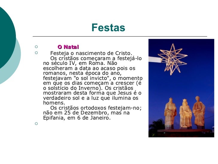 33. 33. Festas <ul><li>         O Natal </li></ul><ul><li>    Festeja o nascimento de Cristo.     Os cristãos começaram a festejá-lo no século IV, em Roma. Não escolheram a data ao acaso pois os romanos, nesta época do ano, festejavam &quot;o sol invicto&quot;, o momento em que os dias começam a crescer (é o solstício do Inverno). Os cristãos mostraram desta forma que Jesus é o verdadeiro sol e a luz que ilumina os homens.     Os cristãos ortodoxos festejam-no; não em 25 de Dezembro, mas na Epifania, em 6 de Janeiro. </li></ul><ul><li>       </li></ul>