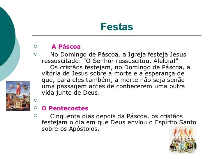 34. 34. Festas <ul><li>      A Páscoa </li></ul><ul><li>    No Domingo de Páscoa, a Igreja festeja Jesus ressuscitado: &quot;O Senhor ressuscitou. Aleluia!&quot;     Os cristãos festejam, no Domingo de Páscoa, a vitória de Jesus sobre a morte e a esperança de que, para eles também, a morte não seja senão uma passagem antes de conhecerem uma outra vida junto de Deus. </li></ul><ul><li>     </li></ul><ul><li>O Pentecostes </li></ul><ul><li>    Cinquenta dias depois da Páscoa, os cristãos festejam o dia em que Deus enviou o Espírito Santo sobre os Apóstolos. </li></ul>