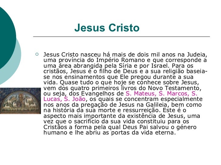 35. 35. Jesus Cristo <ul><li>Jesus Cristo nasceu há mais de dois mil anos na Judeia, uma província do Império Romano e que corresponde a uma área abrangida pela Síria e por Israel. Para os cristãos, Jesus é o filho de Deus e a sua religião baseia-se nos ensinamentos que Ele pregou durante a sua vida. Quase tudo o que hoje se conhece sobre Jesus, vem dos quatro primeiros livros do Novo Testamento, ou seja, dos Evangelhos de S. Mateus, S. Marcos, S. Lucas, S. João , os quais se concentram especialmente nos anos da pregação de Jesus na Galileia, bem como na história da sua morte e ressurreição. Este é o aspecto mais importante da existência de Jesus, uma vez que o sacrifício da sua vida constituiu para os Cristãos a forma pela qual Deus Pai salvou o género humano e lhe abriu as portas da vida eterna. </li></ul>