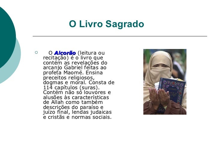 5. 5. O Livro Sagrado <ul><li>  </li></ul><ul><li>   O Alcorão (leitura ou recitação) é o livro que contém as revelações do arcanjo Gabriel feitas ao profeta Maomé. Ensina preceitos religiosos, dogmas e moral. Consta de 114 capítulos (suras). Contém não só louvores e alusões às características de Allah como também descrições do paraíso e juízo final, lendas judaicas e cristãs e normas sociais. </li></ul>