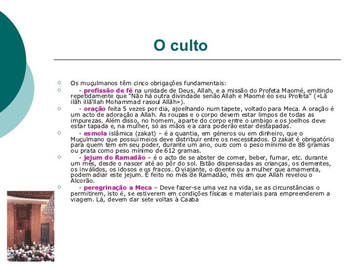 7. 7. O culto <ul><li>Os muçulmanos têm cinco obrigações fundamentais: </li></ul><ul><li>    - profissão de fé na unidade de Deus, Allah, e a missão do Profeta Maomé, emitindo repetidamente que “Não há outra divindade senão Allah e Maomé éo seu Profeta” («Lã ilãh illã'llah Mohammad rasoul Allãh»). </li></ul><ul><li>    - oração feita 5 vezes por dia, ajoelhando num tapete, voltado para Meca. A oração é um acto de adoração a Allah. As roupas e o corpo devem estar limpos de todas as impurezas. Além disso, no homem, a parte do corpo entre o umbigo e os joelhos deve estar tapada e, na mulher, só as mãos e a cara poderão estar destapadas. </li></ul><ul><li>    - esmola islâmica (zakat) – é a quantia, em géneros ou em dinheiro, que o Muçulmano que possui meios deve distribuir entre os necessitados. O zakat é obrigatório para quem tem em seu poder, durante um ano, ouro com o peso mínimo de 88 gramas ou prata como peso mínimo de 612 gramas. </li></ul><ul><li>    - jejum do Ramadão – é o acto de se abster de comer, beber, fumar, etc. durante um mês, desde o nascer até ao pôr do sol. Estão dispensadas as crianças, os dementes, os inválidos, os idosos e os fracos. O viajante, o doente ou a mulher que amamenta, podem adiar este jejum. É feito no mês de Ramadão, mês em que Allah revelou o Alcorão. </li></ul><ul><li>    - peregrinação a Meca – Deve fazer-se uma vez na vida, se as circunstâncias o permitirem, isto é, se estiverem em condições físicas e materiais para empreenderem a viagem. Lá, devem dar sete voltas à Caaba </li></ul>