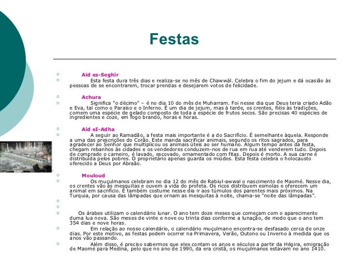 8. 8. Festas <ul><li>        Aid es-Seghír </li></ul><ul><li>            Esta festa dura três dias e realiza-se no mês de Chawwál. Celebra o fim do jejum e dá ocasião às pessoas de se encontrarem, trocar prendas e desejarem votos de felicidade. </li></ul><ul><li>       Achura </li></ul><ul><li>            Significa &quot;o décimo&quot; – é no dia 10 do mês de Muharram. Foi nesse dia que Deus teria criado Adão e Eva, tal como o Paraíso e o Inferno. É um dia de jejum, mas à tarde, os crentes, fiéis às tradições, comem uma espécie de gelado composto de toda a espécie de frutos secos. São precisas 40 espécies de ingredientes e coze, em fogo brando, horas e horas. </li></ul><ul><li>       Aíd eI-Adha </li></ul><ul><li>            A seguir ao Ramadão, a festa mais importante é a do Sacrifício. É semelhante àquela. Responde a uma das prescrições do Corão. Este manda sacrificar animais, segundo os ritos sagrados, para agradecer ao Senhor que multiplicou os animais úteis ao ser humano. Algum tempo antes da festa, chegam rebanhos às cidades e os vendedores conduzem-nos de rua em rua até venderem tudo. Depois de comprado o carneiro, é lavado, escovado, ornamentado com fitas. Depois é morto. A sua carne é distribuída pelos pobres. O proprietário apenas guarda os miúdos. Esta festa celebra o holocausto oferecido a Deus por Abraão. </li></ul><ul><li>        Mouloud </li></ul><ul><li>            Os muçulmanos celebram no dia 12 do mês de Rabiul-awwal o nascimento de Maomé. Nesse dia, os crentes vão às mesquitas e ouvem a vida do profeta. Os ricos distribuem esmolas e oferecem um animal em sacrifício. É também costume nesse dia ir aos túmulos dos parentes mais próximos. Na Turquia, por causa das lâmpadas que ornam as mesquitas à noite, chama-se &quot;noite das lâmpadas&quot;. </li></ul><ul><li>  </li></ul><ul><li>        </li></ul><ul><li>     Os árabes utilizam o calendário lunar. O ano tem doze meses que começam com o aparecimento duma lua nova. São meses de vinte e nove ou trinta dias conforme a lunação, de modo que o ano tem 354 dias e nove horas. </li></ul><ul><li>            Em relação ao nosso calendário, o calendário muçulmano encontra-se desfasado cerca de onze dias. Por este motivo, as festas podem ocorrer na Primavera, Verão, Outono ou Inverno à medida que os anos vão passando. </li></ul><ul><li>            Além disso, é preciso sabermos que eles contam os anos e séculos a partir da Hégira, emigração de Maomé para Medina, pelo que no ano de 1990, da era cristã, os muçulmanos estavam no ano 1410. </li></ul>