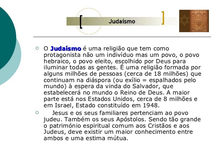 9. 9. <ul><li>O Judaísmo é uma religião que tem como protagonista não um indivíduo mas um povo, o povo hebraico, o povo eleito, escolhido por Deus para iluminar todas as gentes. É uma religião formada por alguns milhões de pessoas (cerca de 18 milhões) que continuam na diáspora (ou exílio = espalhados pelo mundo) à espera da vinda do Salvador, que estabelecerá no mundo o Reino de Deus. A maior parte está nos Estados Unidos, cerca de 8 milhões e em Israel, Estado constituído em 1948. </li></ul><ul><li>    Jesus e os seus familiares pertenciam ao povo judeu. Também os seus Apóstolos. Sendo tão grande o património espiritual comum aos Cristãos e aos Judeus, deve existir um maior conhecimento entre ambos e uma estima mútua. </li></ul>