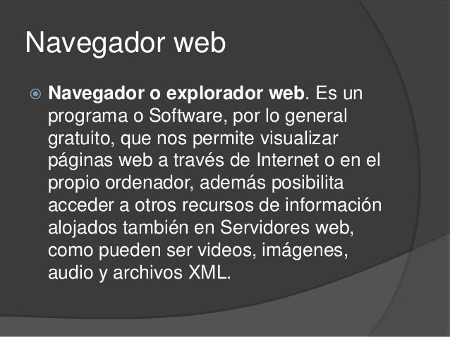 1. 1. Navegador web Navegador o explorador web. Es un programa o Software, por lo general gratuito, que nos permite visualizar páginas web a través de Internet o en el propio ordenador, además posibilita acceder a otros recursos de información alojados también en Servidores web, como pueden ser videos, imágenes, audio y archivos XML.