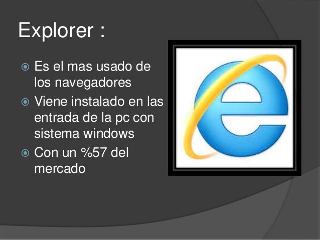 3. 3. Explorer : Es el mas usado de los navegadores Viene instalado en las entrada de la pc con sistema windows Con un %57 del mercado