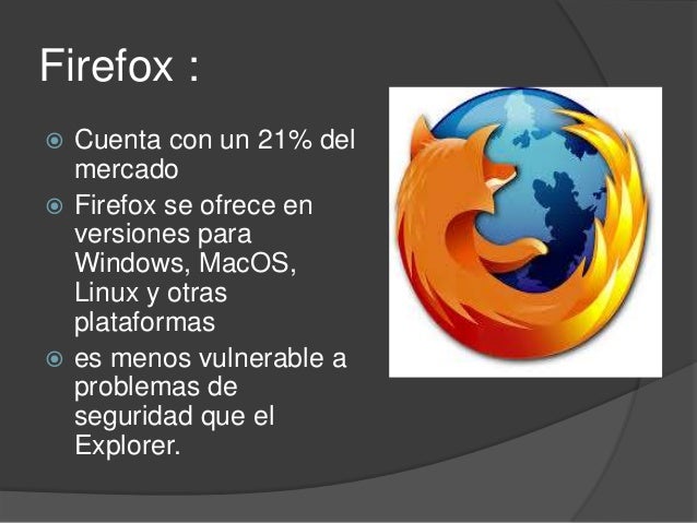 4. 4. Firefox : Cuenta con un 21% del mercado Firefox se ofrece en versiones para Windows, MacOS, Linux y otras plataformas es menos vulnerable a problemas de seguridad que el Explorer.