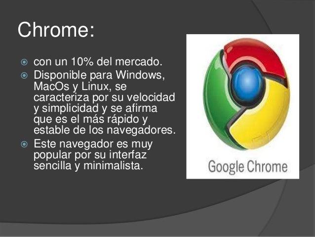 5. 5. Chrome: con un 10% del mercado. Disponible para Windows, MacOs y Linux, se caracteriza por su velocidad y simplicidad y se afirma que es el más rápido y estable de los navegadores. Este navegador es muy popular por su interfaz sencilla y minimalista.