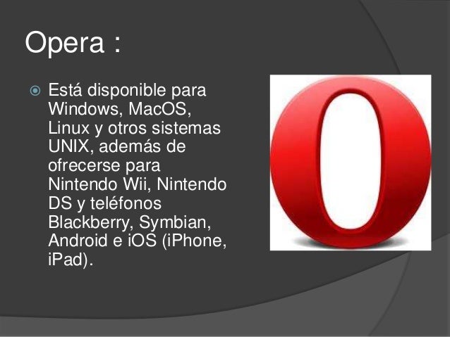 6. 6. Opera : Está disponible para Windows, MacOS, Linux y otros sistemas UNIX, además de ofrecerse para Nintendo Wii, Nintendo DS y teléfonos Blackberry, Symbian, Android e iOS (iPhone, iPad).