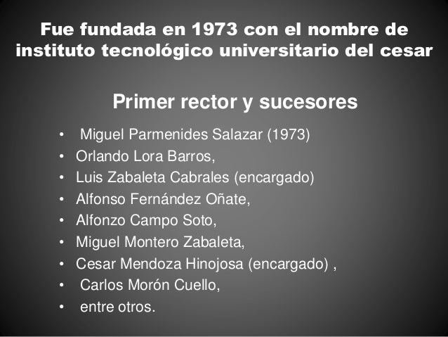 3. 3. Fue fundada en 1973 con el nombre de instituto tecnológico universitario del cesar Primer rector y sucesores • Miguel Parmenides Salazar (1973) • Orlando Lora Barros, • Luis Zabaleta Cabrales (encargado) • Alfonso Fernández Oñate, • Alfonzo Campo Soto, • Miguel Montero Zabaleta, • Cesar Mendoza Hinojosa (encargado) , • Carlos Morón Cuello, • entre otros.