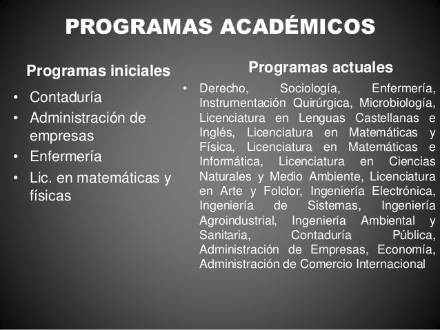 4. 4. PROGRAMAS ACADÉMICOS Programas iniciales • Contaduría • Administración de empresas • Enfermería • Lic. en matemáticas y físicas Programas actuales • Derecho, Sociología, Enfermería, Instrumentación Quirúrgica, Microbiología, Licenciatura en Lenguas Castellanas e Inglés, Licenciatura en Matemáticas y Física, Licenciatura en Matemáticas e Informática, Licenciatura en Ciencias Naturales y Medio Ambiente, Licenciatura en Arte y Folclor, Ingeniería Electrónica, Ingeniería de Sistemas, Ingeniería Agroindustrial, Ingeniería Ambiental y Sanitaria, Contaduría Pública, Administración de Empresas, Economía, Administración de Comercio Internacional