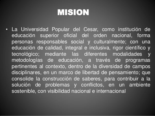 5. 5. MISION • La Universidad Popular del Cesar, como institución de educación superior oficial del orden nacional, forma personas responsables social y culturalmente; con una educación de calidad, integral e inclusiva, rigor científico y tecnológico; mediante las diferentes modalidades y metodologías de educación, a través de programas pertinentes al contexto, dentro de la diversidad de campos disciplinares, en un marco de libertad de pensamiento; que consolide la construcción de saberes, para contribuir a la solución de problemas y conflictos, en un ambiente sostenible, con visibilidad nacional e internacional
