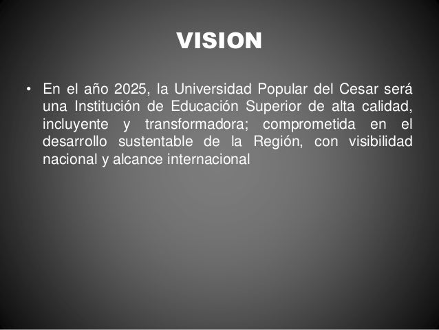 6. 6. VISION • En el año 2025, la Universidad Popular del Cesar será una Institución de Educación Superior de alta calidad, incluyente y transformadora; comprometida en el desarrollo sustentable de la Región, con visibilidad nacional y alcance internacional