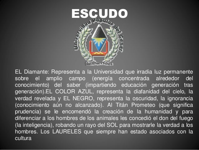 8. 8. ESCUDO EL Diamante: Representa a la Universidad que irradia luz permanente sobre el amplio campo (energía concentrada alrededor del conocimiento) del saber (impartiendo educación generación tras generación).EL COLOR AZUL, representa la diafanidad del cielo, la verdad revelada y EL NEGRO, representa la oscuridad, la ignorancia (conocimiento aún no alcanzado). Al Titán Prometeo (que significa prudencia) se le encomendó la creación de la humanidad y para diferenciar a los hombres de los animales les concedió el don del fuego (la inteligencia), robando un rayo del SOL para mostrarle la verdad a los hombres. Los LAURELES que siempre han estado asociados con la cultura