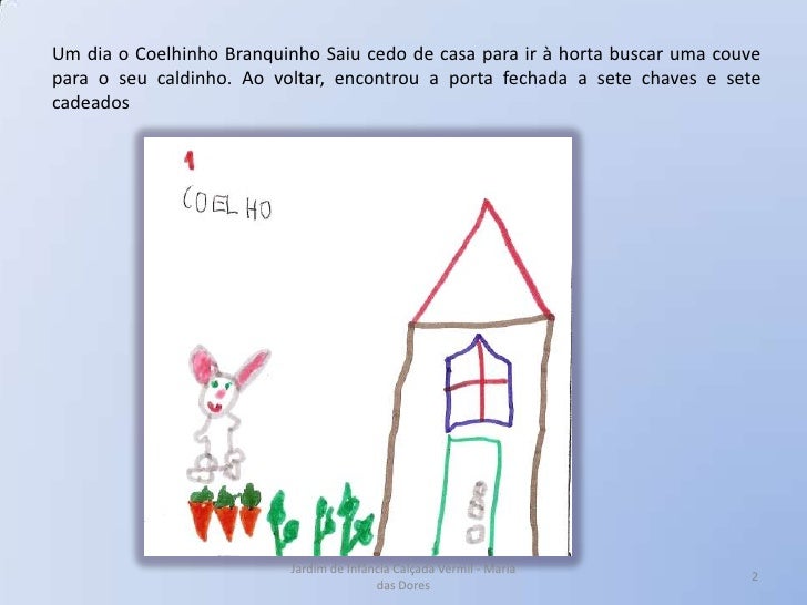 2. 2. Um dia o Coelhinho Branquinho Saiu cedo de casa para ir à horta buscar uma couve para o seu caldinho. Ao voltar, encontrou a porta fechada a sete chaves e sete cadeados<br />2<br />Jardim de Infância Calçada Vermil - Maria das Dores<br />