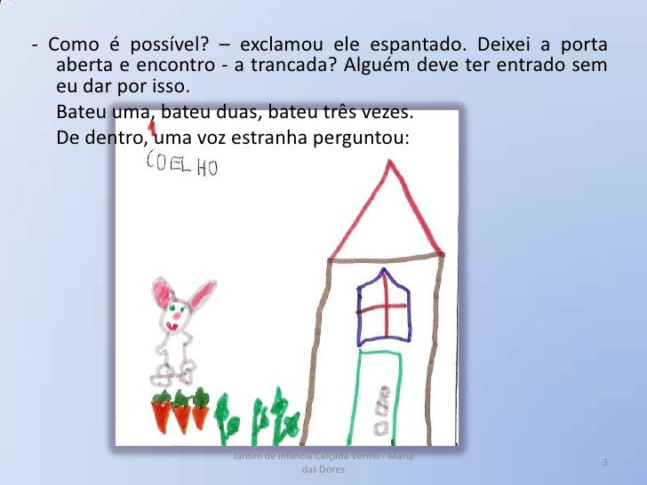 3. 3. - Como é possível? – exclamou ele espantado. Deixei a porta abertae encontro - a trancada? Alguém deve ter entrado sem eudar por isso.<br /> Bateu uma, bateu duas, bateu três vezes.<br /> De dentro, uma voz estranha perguntou:<br />3<br />Jardim de Infância Calçada Vermil - Maria das Dores<br />
