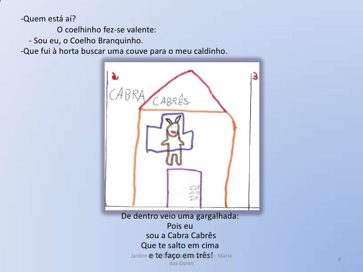 5. 5. Que fui à horta buscar uma couve para o meu caldinho.</li></ul>De dentro veio uma gargalhada:<br />Pois eu<br /> sou a Cabra CabrêsQue te salto em cima<br /> e te faço em três!<br />4<br />Jardim de Infância Calçada Vermil - Maria das Dores<br />